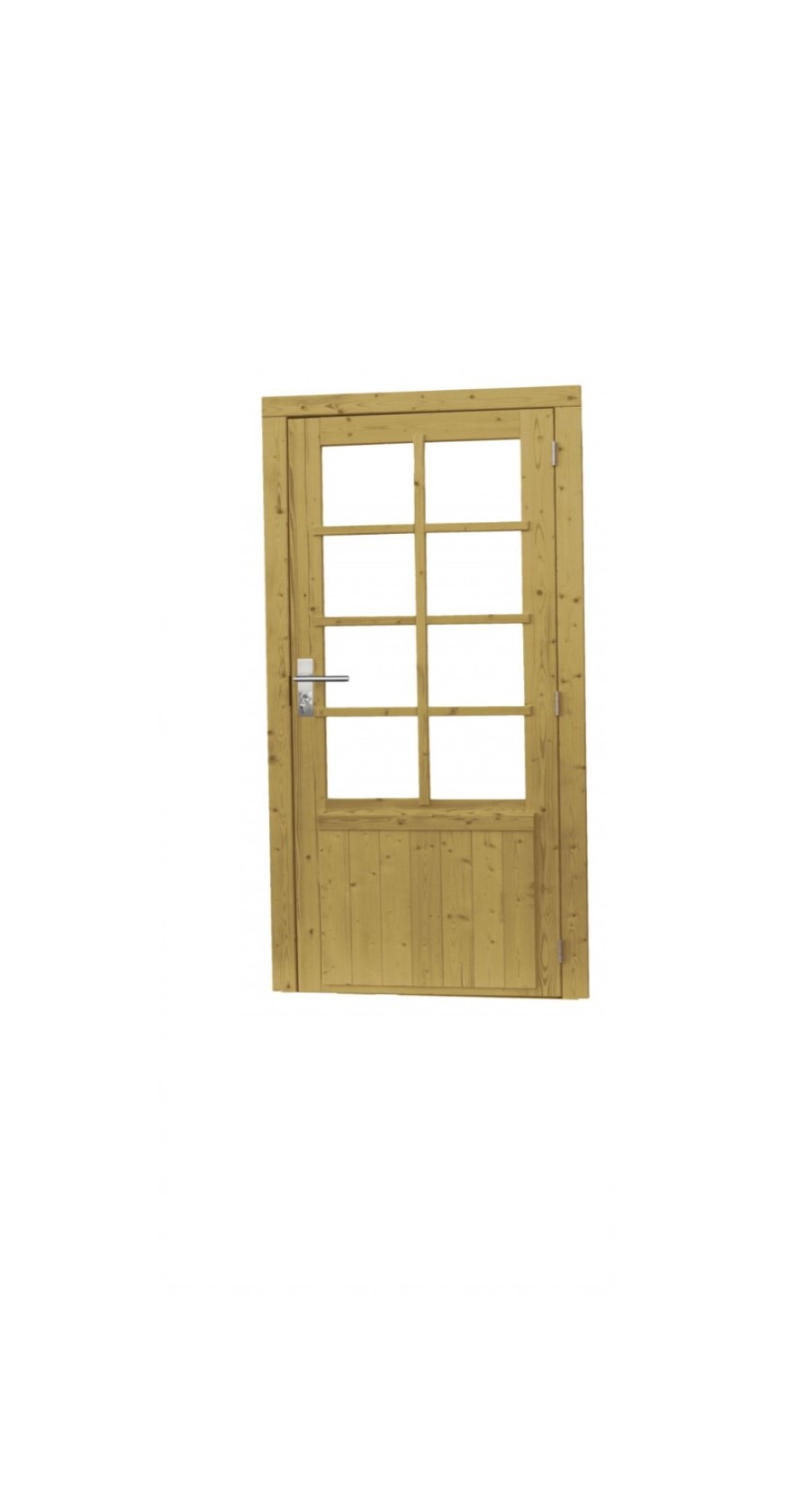 300201 – Vuren enkele 8-ruits deur inclusief kozijn, rechtsdraaiend, 900mm x 2010mm, groen geïmpregneerd.