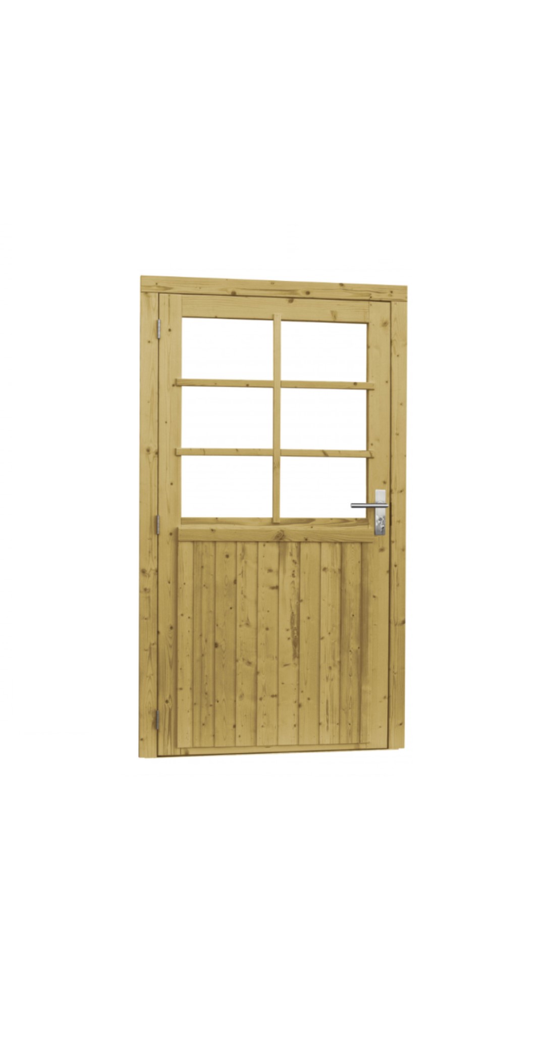 300214 – Vuren enkele 6-ruits deur extra breed inclusief kozijn, linksdraaiend, 1120mm x 2010mm, groen geïmpregneerd.