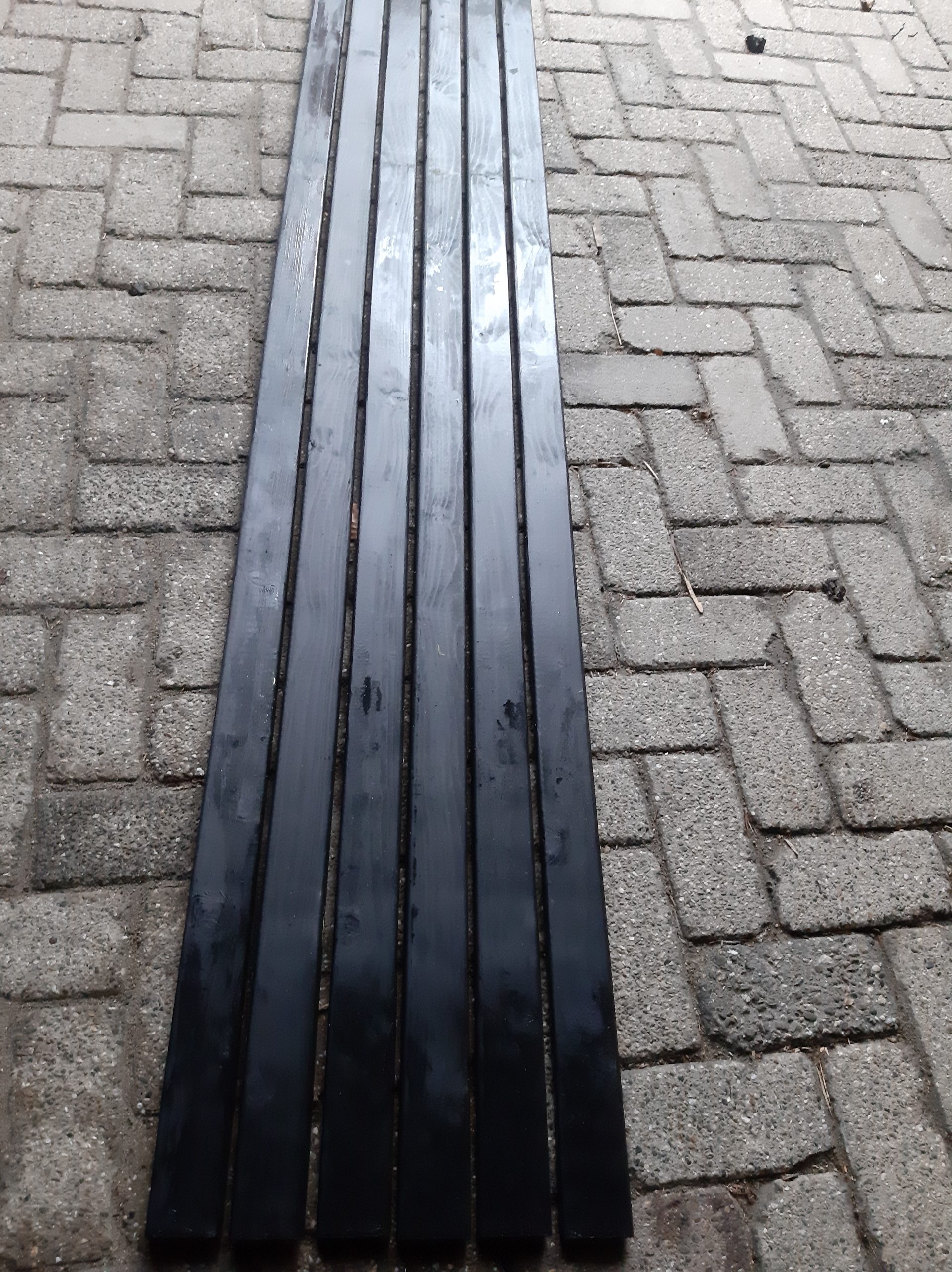 Planken geschaafd 21 x 58 x 3000mm eerst geïmpregneerd daarna zwart gespoten rondom 2 keer ral 9005